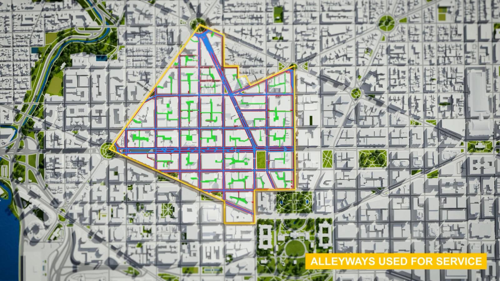 Chen introduced his concept, The DC Greenways Project, which looks to create a meaningful public realm, convert existing office buildings into a mixed-use campus with affordable retail on the ground floor and a pathway of expanded alleyways that become a major public asset.